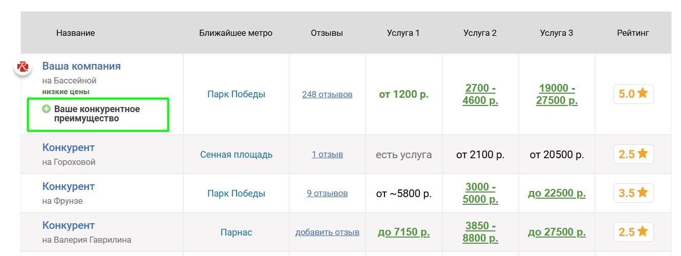 компаний, продвигаемая компания попадёт к ним в таблицу «Сравнение по ценам», которая выглядит следующим образом: